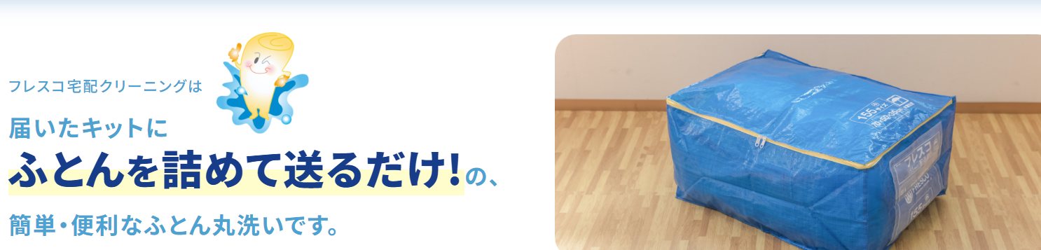 「ふとんクリーニングのフレスコ」は、重くてかさばる布団を自宅から発送するだけで、本格的な丸洗いクリーニングが受けられる宅配型サービスです。全国対応・往復送料無料で、忙しい方や車を持たない方でも気軽に利用できる点が支持されています。