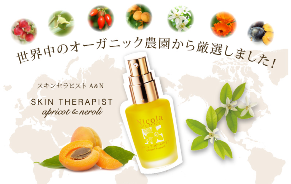 NICOLA organicsの看板アイテム「スキンセラピスト A&N」は、100%植物原料で構成された本格オーガニック美容オイルです。肌なじみの良いアプリコットオイルをベースに、バオバブオイルやクランベリーオイル、ローズヒップオイルなどが配合され、肌のハリと潤いを長時間保つ実力派処方になっています。オイルながらべたつきにくく、朝晩のスキンケアに取り入れやすいテクスチャーです。ECOCERT認証を取得しており、肌へのやさしさと安全性にも配慮されています。
