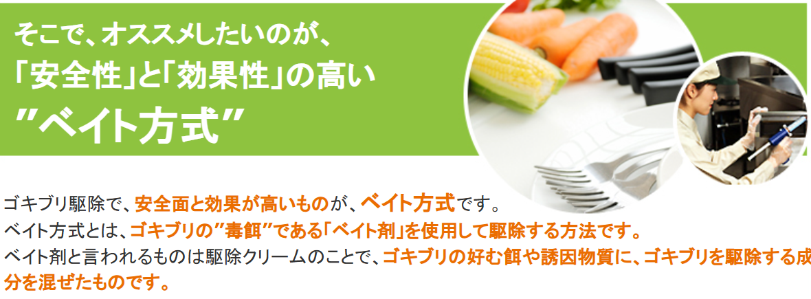 従来の駆除といえば、部屋全体に薬剤を噴霧して、しばらく入室できないようなイメージがあるかもしれません。しかし、ダスキンでは主に「ベイト方式」を採用しています。
