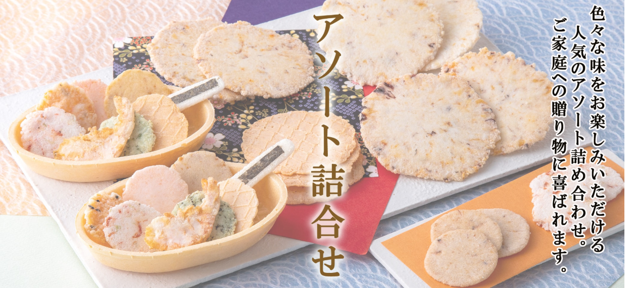 | 千なり(せんなり) | えびせん家族を代表する詰め合わせ。多彩な味が一度に楽しめ、ギフトに一番人気。 |